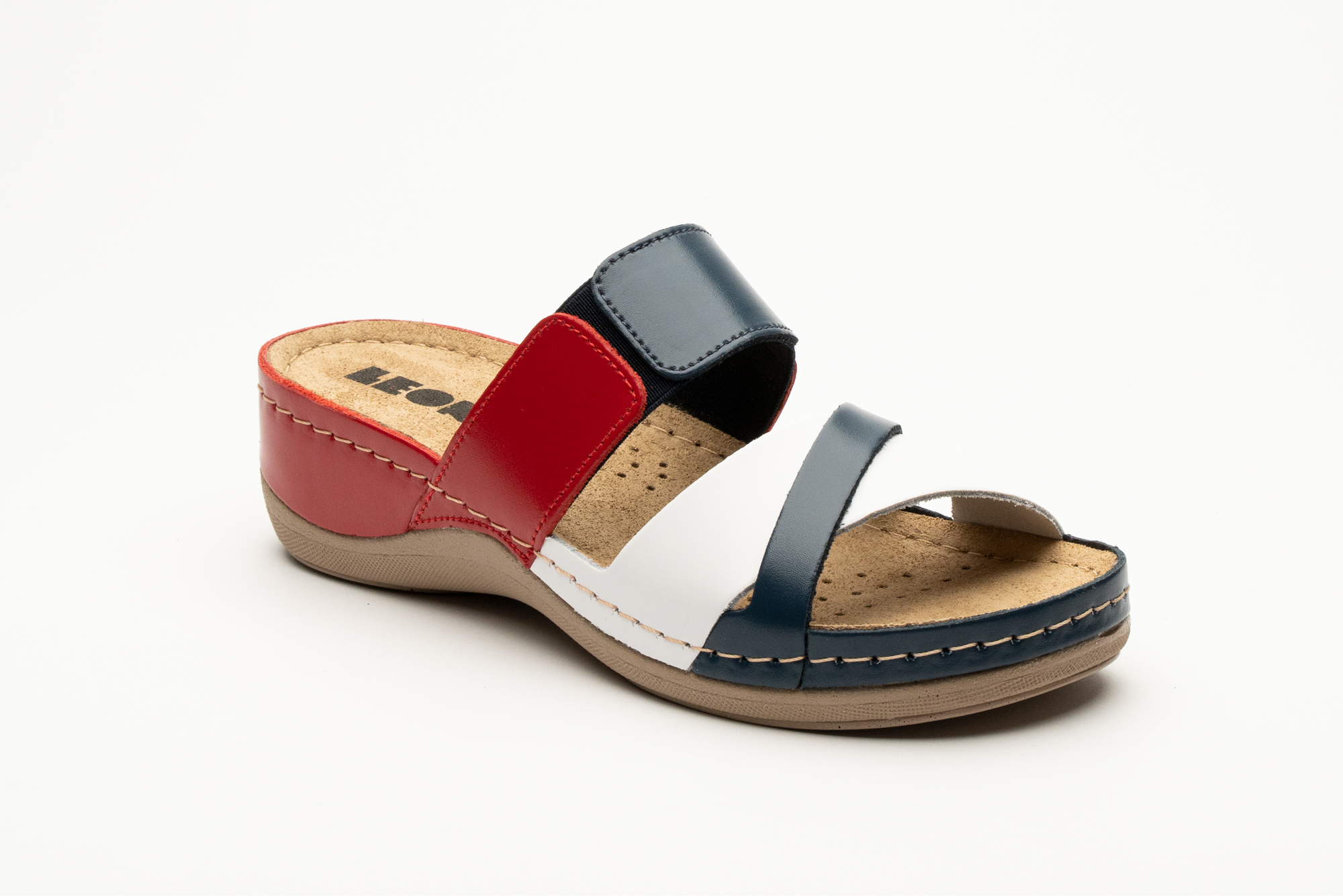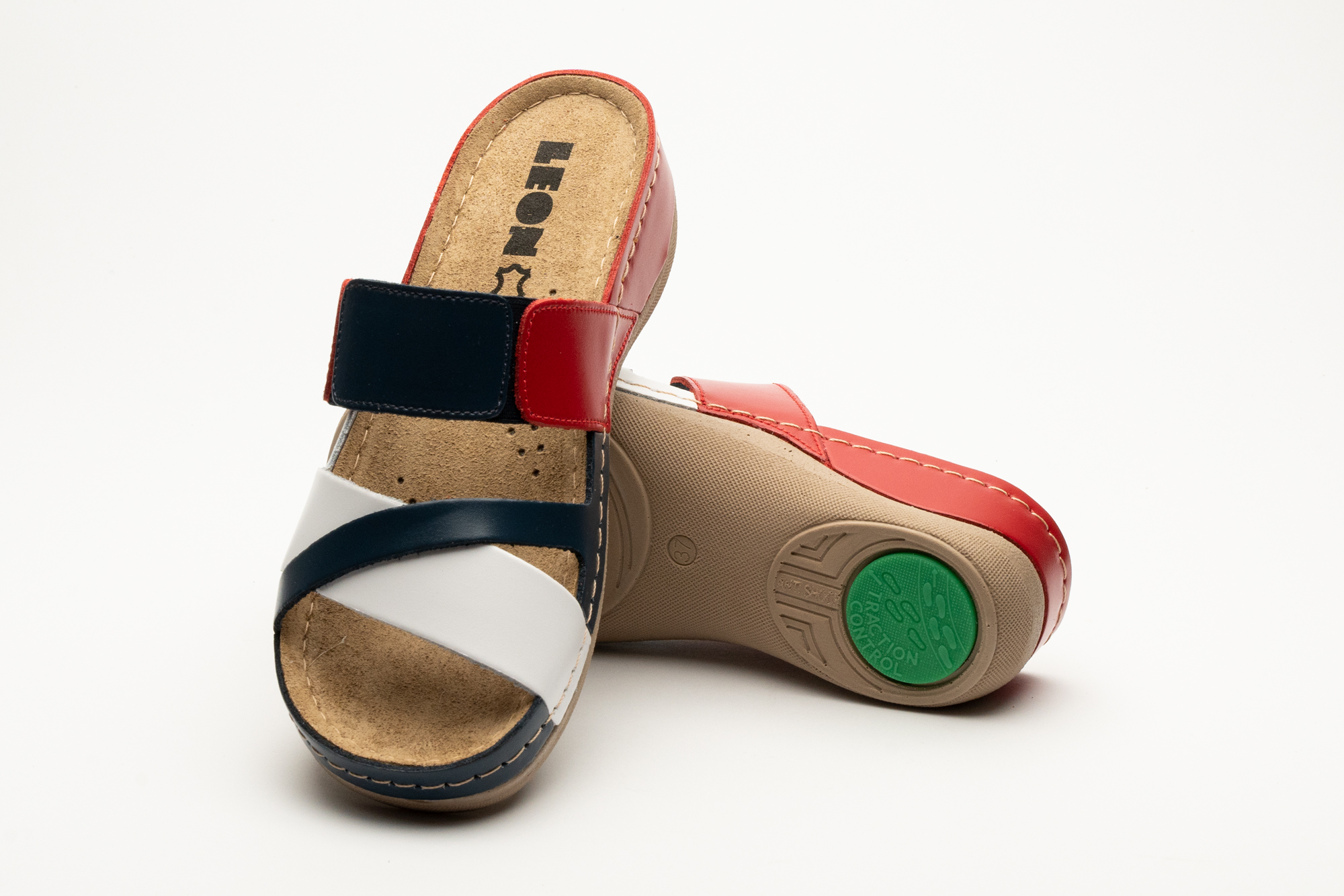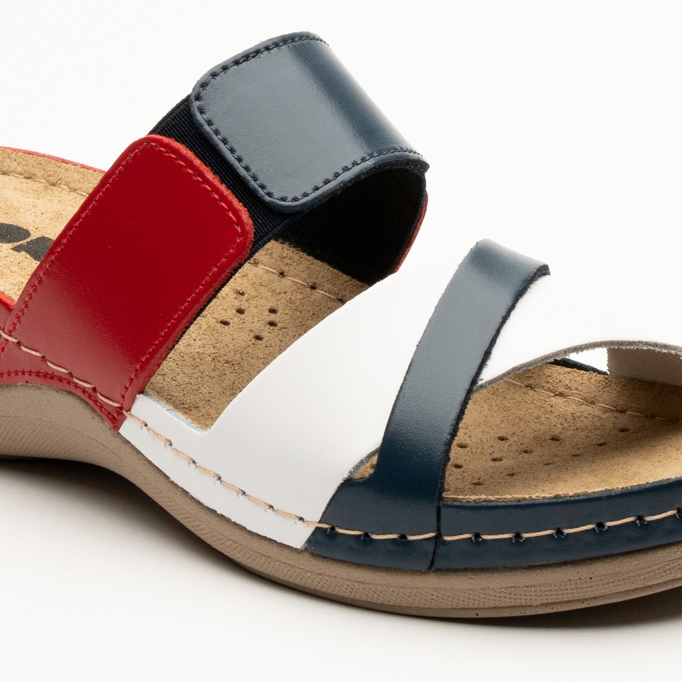 Ženska papuča izrađena od prirodne kože i kožnom tabanicom koja sadrži masažni gel. Đon je naparvljen od poliuretanske mase koji sadrži anti – slip čep koji sprečava klizanje.